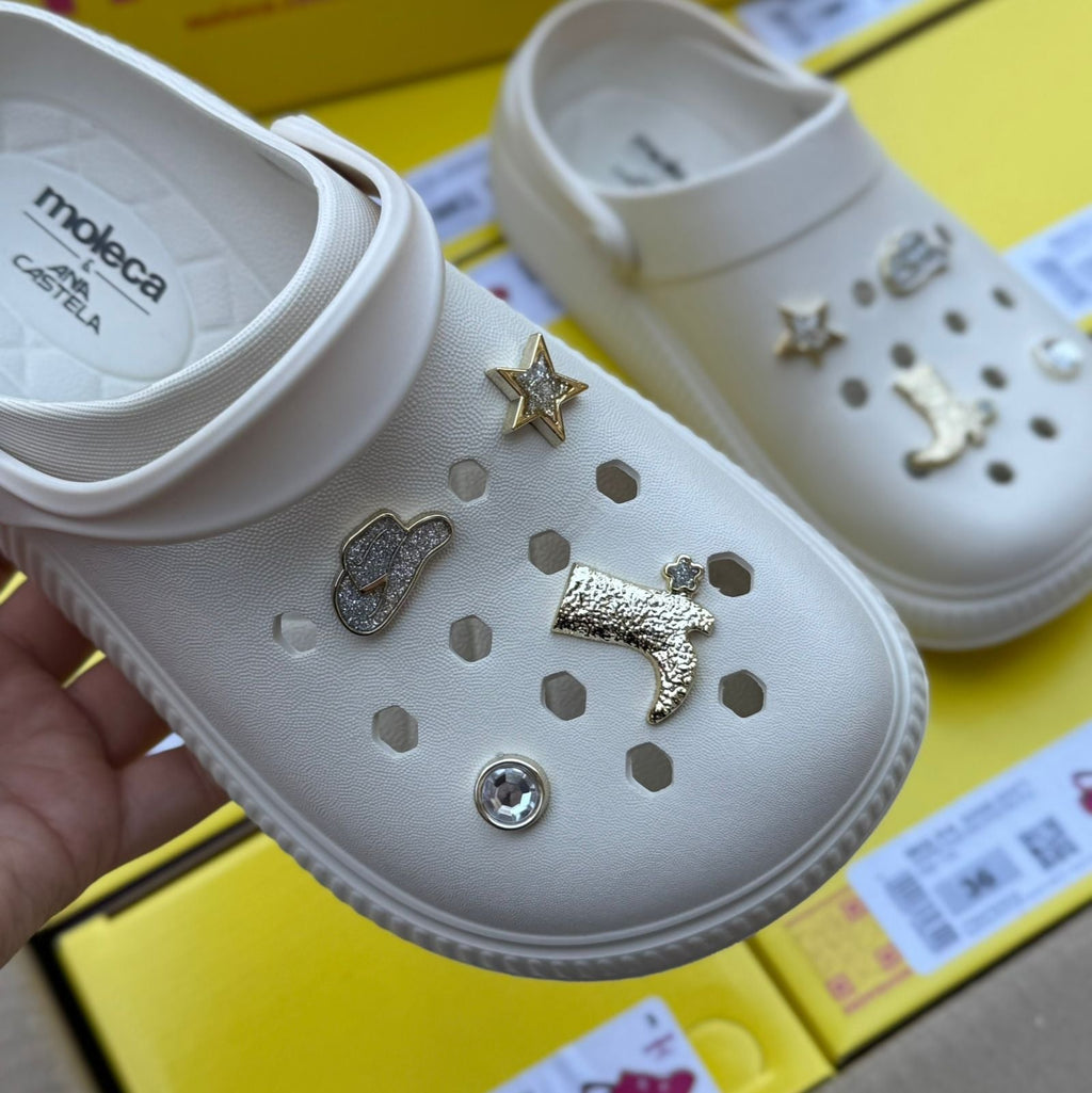 Produzida em material leve e resistente, ela é ideal pra usar no dia a dia, seja na correria da cidade ou no clima de fazenda. O grande destaque fica por conta dos Charms personalizados — com elementos como chapéu, bota country e estrela — que trazem toda a essência do agro com um visual estiloso e divertido.