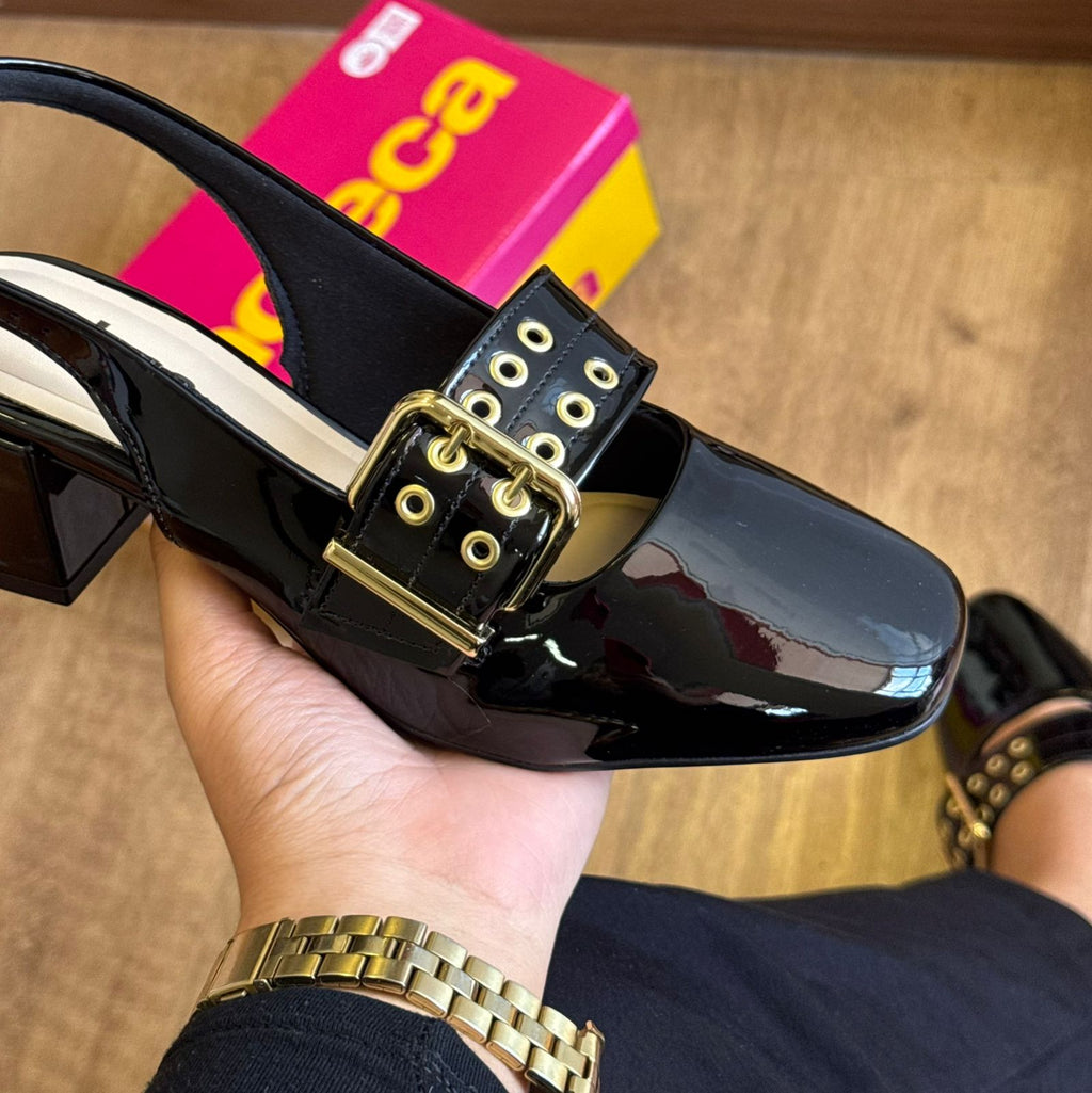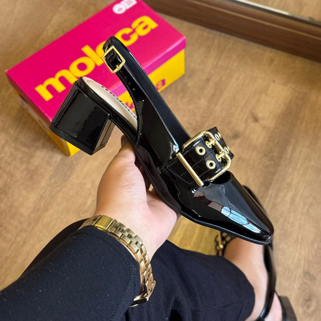 A Sandália Moleca Verniz com Fivela 5576.104 é puro charme e sofisticação. Com acabamento envernizado e salto bloco médio, ela oferece equilíbrio perfeito entre conforto e estilo. O detalhe da fivela dourada adiciona um toque de elegância que transforma qualquer look, seja para o dia ou para a noite.